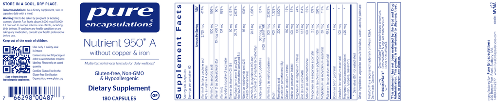 Nutrient 950® A without copper & iron is a complete hypoallergenic multi-vitamin and multi-mineral supplement. Our multivitamin is complete with activated vitamins and chelated minerals to promote optimal absorption.