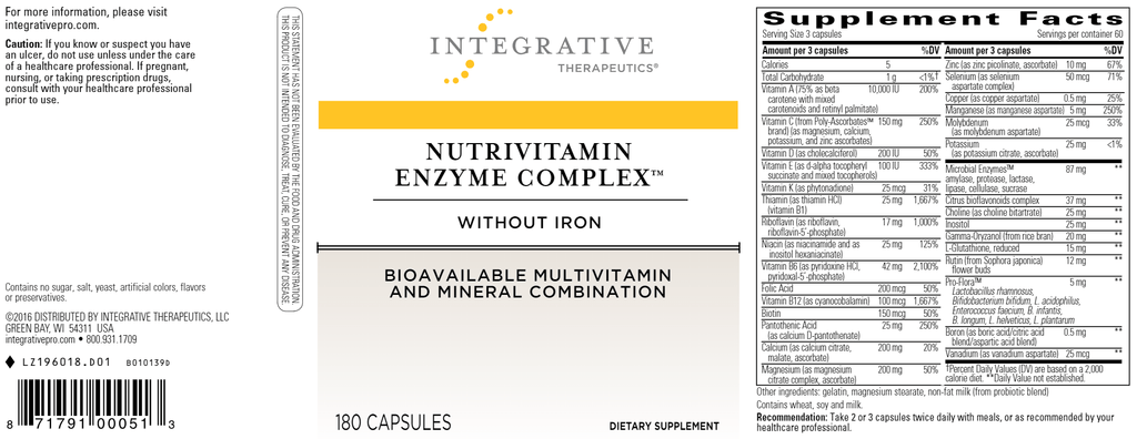 NutriVitamin Enzyme Complex™ absorbable multi formula without iron is a comprehensive multivitamin and mineral supplement with synergistic microbial enzymes, probiotics, and antioxidant support (vitamin C, E, and selenium) for optimal nutritional maintenance.*