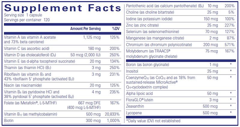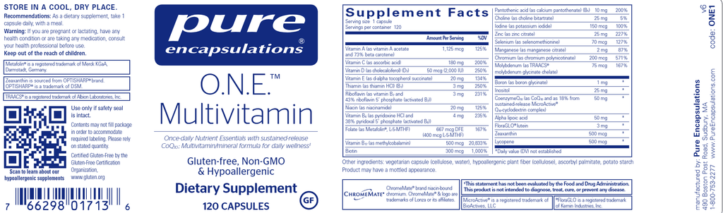 O.N.E™ Multivitamin provides vitamins, minerals and other essential nutrients to provide a comprehensive once-daily multivitamin for both men and women. O.N.E multivitamin specifically provides antioxidant support as well as promotes cellular and optical health.