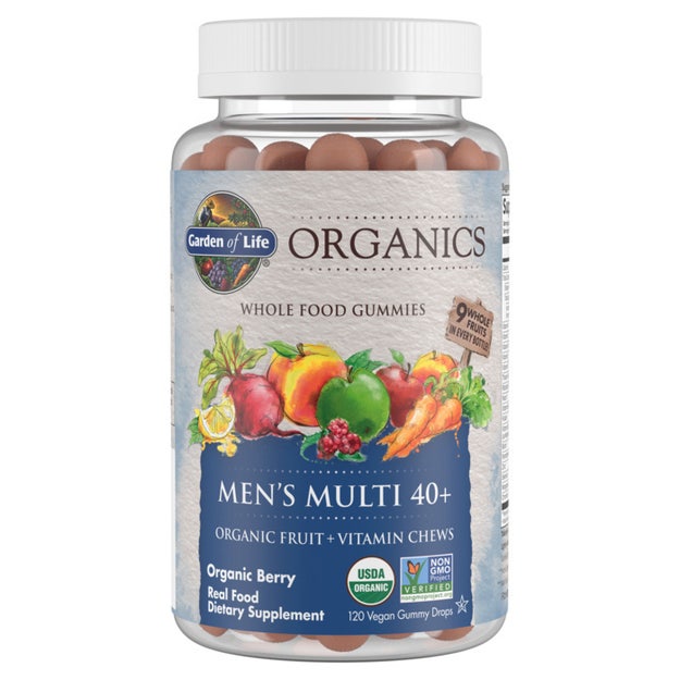 Organics Men’s 40+ Multi Gummies are Certified USDA Organic and Non-GMO Project Verified fruit and vitamin gummies. Made with nine organic whole fruits in every bottle—no synthetic vitamins—Organics Men’s 40+ Multi come in a great-tasting organic berry chew made with pectin from non-GMO apples and organic orange peel—no pig gelatin.