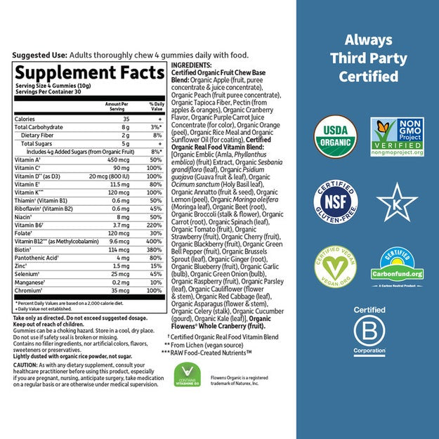 Made with only whole food ingredients, Organics Men’s 40+ Multi Gummies have targeted ingredients to support the needs of men over 40 including vitamin E and folate, 800IU of Vegan D3 and Organic Flowens® whole food cranberry.