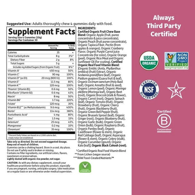 Made with only whole food ingredients, Organics Women’s Multi 40+ Gummies have targeted ingredients to support the needs of women over 40 including Organic Black Cohosh and 800IU Vegan D3.