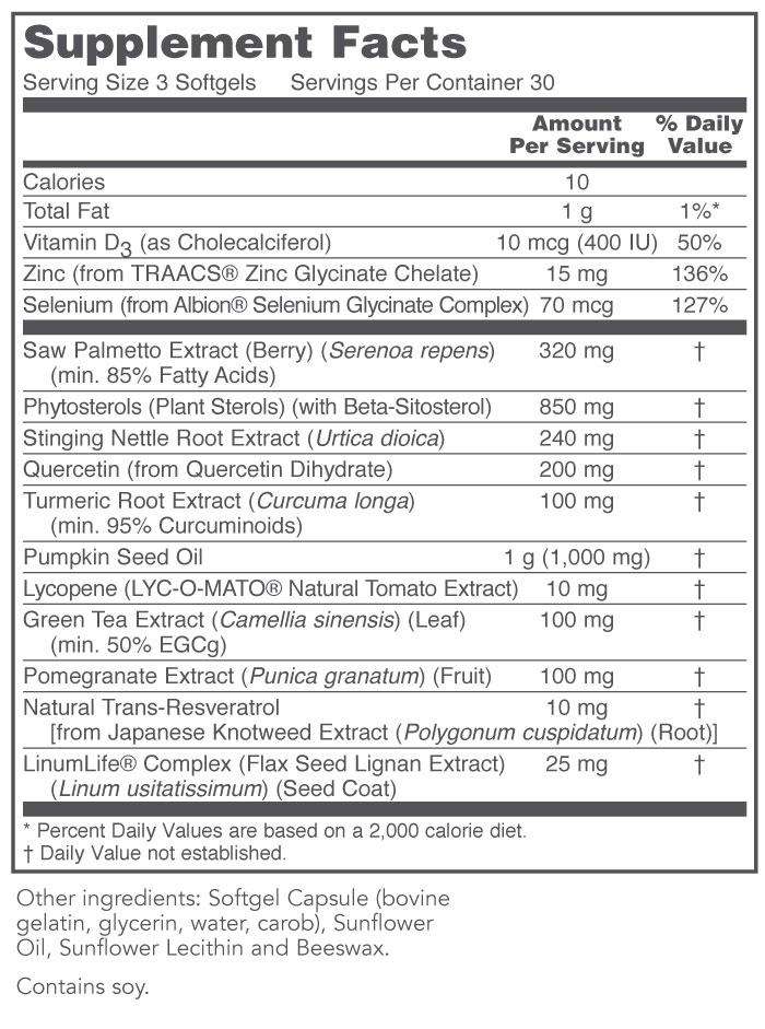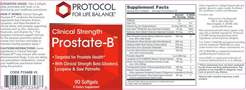 Clinical Strength Prostate-B™ combines the botanical ingredients Saw Palmetto Extract, Lycopene, and Beta-Sitosterol at clinical doses, with prostate supporting nutrients such as Zinc, Selenium, Quercetin, and Vitamin D3.* This targeted nutritional support formula for the prostate promotes optimal urinary tract function and helps to maintain healthy prostate tissue.* U.S. Patent 7,838,042 and patents pending, and the trademark TRAACS® are used under license from Albion Laboratories, Inc. LYC-O-MATO® is a registered trademark of LycoRed Natural Products Ltd. LinumLife® is a registered trademark of Frutarom Netherlands B.V. or its affiliates.