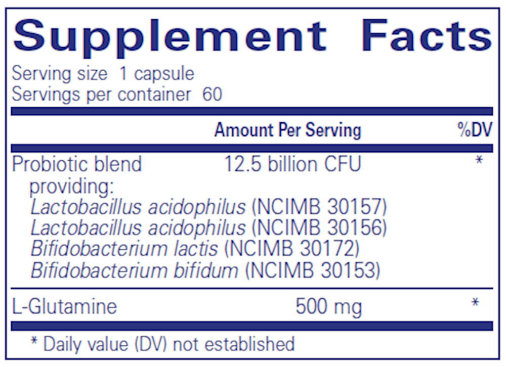 4-strain, clinically-researched proprietary probiotic blend combined with l-glutamine for G.I. comfort and health.