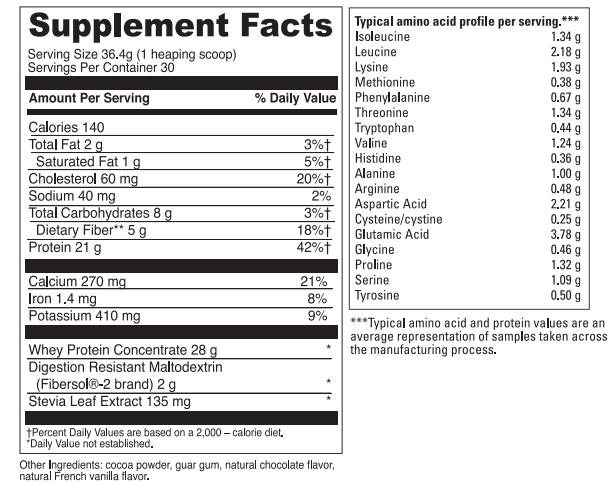Suggested Use: As a dietary supplement, mix one heaping scoop (36.4 g) daily in 6-8 ounces of water, milk substitute or your favorite beverage, or as directed by your healthcare practitioner. For best results, serve cold and use shaker or blender.
