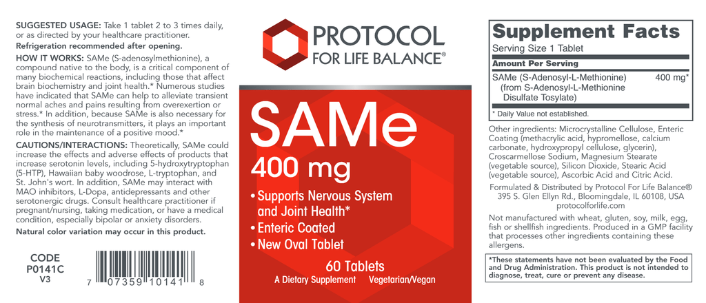 SAMe (S-adenosylmethionine), a compound native to the body, is a critical component of many biochemical reactions, including those that affect brain biochemistry and joint health.* Numerous studies have indicated that SAMe can help to alleviate transient normal aches and pains resulting from overexertion or stress.* In addition, because SAMe is also necessary for the synthesis of neurotransmitters, it plays an important role in the maintenance of a positive mood.*