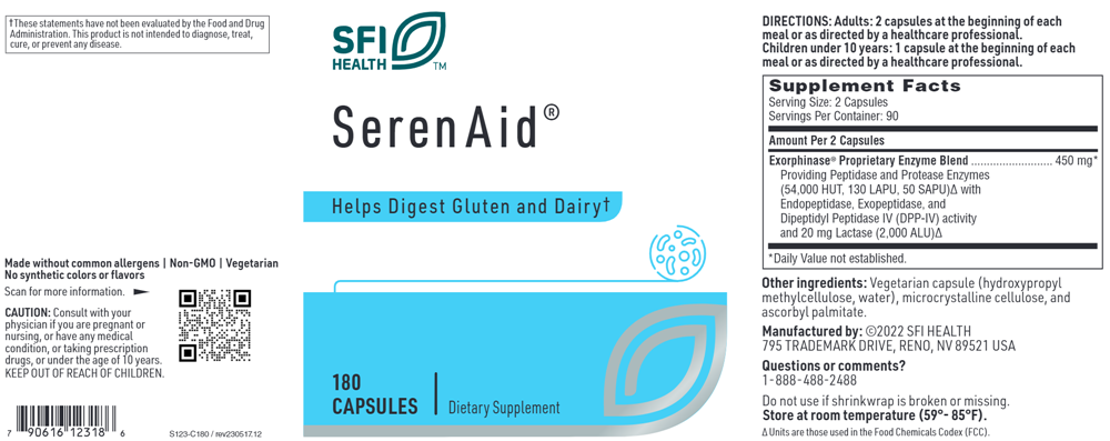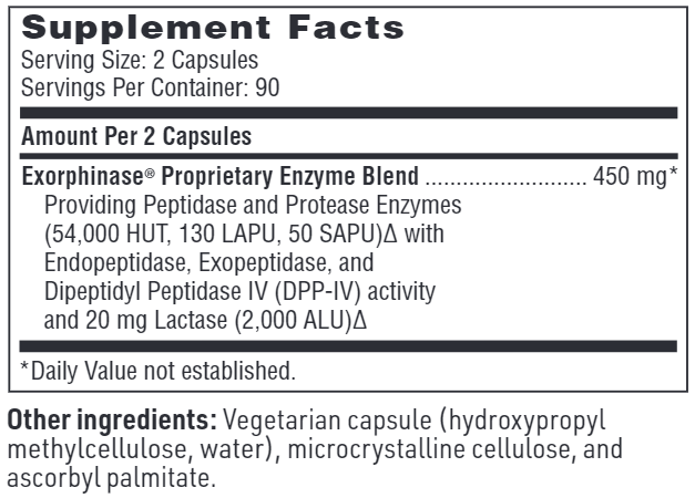 A proprietary blend of microbial enzymes, SerenAid® is specifically formulated to assist in breaking down a broad range of plant and animal proteins, including casein (milk and dairy products), gluten (wheat, rye, oats, barley, and other grains), and soy proteins. The inclusion of Exorphinase® differentiates SerenAid® from other digestive enzyme formulas. This proprietary, high-activity enzyme blend of peptidase and protease with dipeptidyl peptidase IV (DPP-IV) activity can assist in hydrolyzing small protein peptides, including casomorphins and gluteomorphins that can adversely affect the central nervous system in some individuals.† The enzymes in this formulation are pH-stable, demonstrating activity over a wide range of pH conditions (pH of 2 to 12).