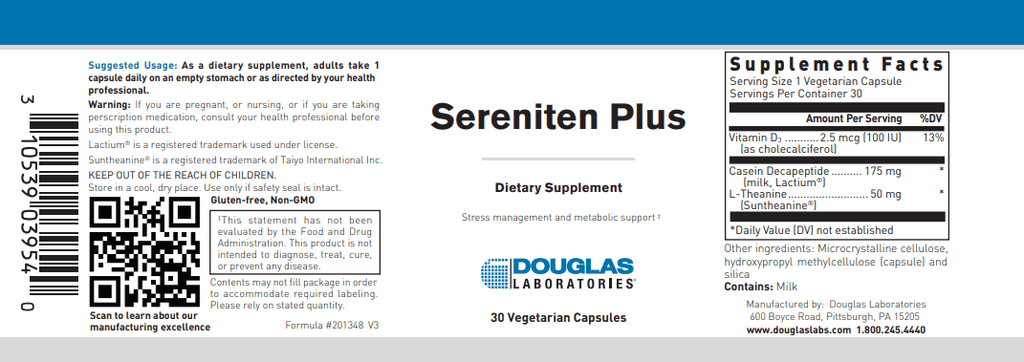 Sereniten Plus is a unique combination of clinically studied Lactium® casein decapeptide, L-theanine, and vitamin D to support the hypothalamic-pituitary-adrenal (HPA) axis and feedback loop. This formula supports stress management, cortisol regulation, and stress-related metabolic functions.