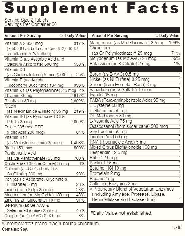 A high potency vegetarian multiple vitamin/mineral for adults that provides a complete range of nutrients in forms your body can use most efficiently. It also contains 50 important nutrients including ergogenic factors, brain fueling nutrients, a complete and balanced Stress B complex, vegetarian enzymes, and antioxidants such as Vitamin A, Beta Carotene, Vitamin E and the mineral Selenium in levels higher than what is provided in other multiple formulas. Four tablet formula.