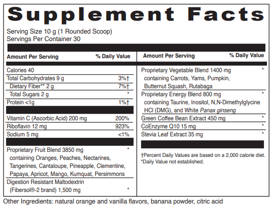 Spectra Oranges™ is a tasty combination of fresh fruits and vegetables blended with an array of energizing nutrients.* Green Coffee Bean extract provides natural caffeine and chlorogenic acids to support energy levels without the negative effects associated with caffeinated beverages. DMG, taurine, inositol, and White Panax Ginseng further enhance this fast-acting formula. Providing 3,000 ORAC units per serving, Spectra Oranges™ is a smart and delicious way to start your morning.