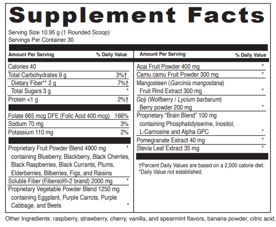 Spectra Purples™ is a delicious healthy aging drink mix that combines 19 whole fruits, vegetables and extracts.* Some of natures most protective foods are darkly colored fruits & vegetables because they naturally contain potent antioxidant Vitamin C and a variety of cell protective nutrients.* Also included are healthy aging nutrients: Alpha GPC, L-Carnosine and Folic Acid to support mental energy, focus and clarity.* Spectra Purples™ has a delicious berry flavor enhanced by the natural sweetness of stevia and purple carrot.*