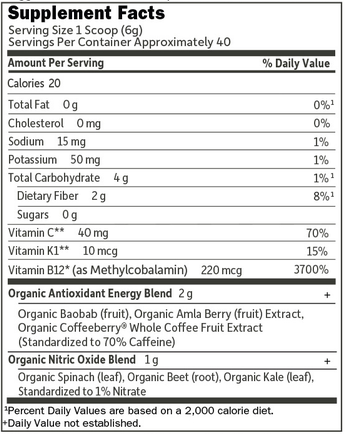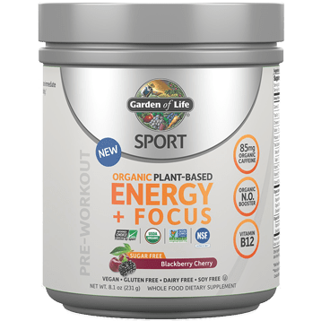 Garden of Life’s pre-workout “Energy + Focus” is available as a delicious organic Blackberry drink (also available in Sugar Free) and is designed to boost energy levels and help you focus during your workouts.† Made only with clean, plant–based organic ingredients, it delivers clean fuel in the form of 85mg of naturally occurring caffeine from organic Coffeeberry to provide mental focus during your workout.† Vitamin B12, an important nutrient required for fat and carbohydrate metabolism, is often depleted in athletes and vegans. We added 220mcg of wholefood vitamin B12 to optimize energy production.† Energy + Focus utilizes a unique nitric oxide blend consisting only of organic veggies including organic kale, spinach and beets rich in nitrates to deliver oxygen and fuel to muscles.†