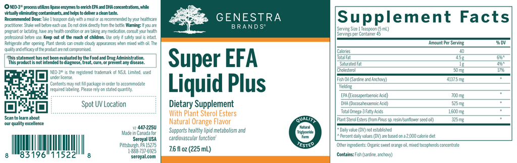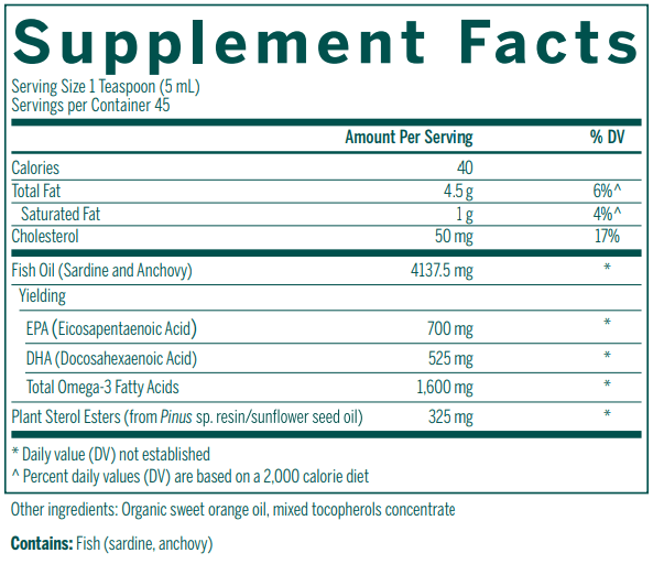 Recent research indicates that cardiovascular health may be better supported by diets high in monounsaturated fatty acids, plant sterols, and fish oils than by those high in fish oils alone. EPA, DHA, and plant sterols support healthy fatty acid metabolism. In randomized, placebo-controlled trials, daily supplementation with 1.3-1.4 g of EPA and DHA, in combination with 2-2.5 g of plant sterols, for three to four weeks supported healthy lipid metabolism. Super EFA Liquid Plus provides 1.6 g of EPA and DHA and 325 mg of plant sterols per serving to help support cardiovascular health.*