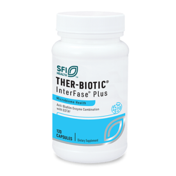 Biofilms are protective encasements formed by microorganisms making them highly resistant to antimicrobials. Ther-Biotic® InterFase® Plus is a unique enzyme formulation designed to break up the biofilm matrix that embeds the GI organisms along with EDTA to bind biofilm-forming metals.†