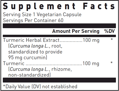 Turmeric Max-V, provided by Douglas Laboratories, supplies 100 mg of turmeric in each vegetarian capsule.