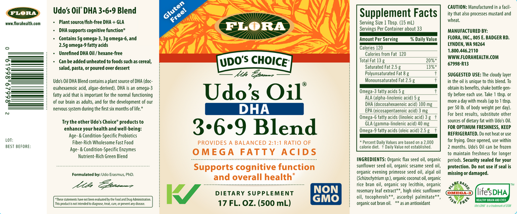 Soak up the benefits of DHA, sustainably, with Udo’s Oil® DHA 3 • 6 • 9 Blend. It combines DHA from unrefined, uncontaminated, sustainably-sourced DHA-rich algae, rather than fish, with Udo’s unique oil blend of omega-3 and omega-6 essential fatty acids in a balanced 2 to 1 ratio with omega-9 fatty acids too. DHA supports the proper functioning of our brains as adults, and supports the development of the nervous system in children.*