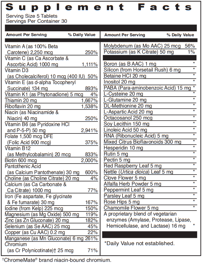A vegetarian multiple vitamin/mineral supplement containing 58 nutrients for pregnant and nursing mothers.*