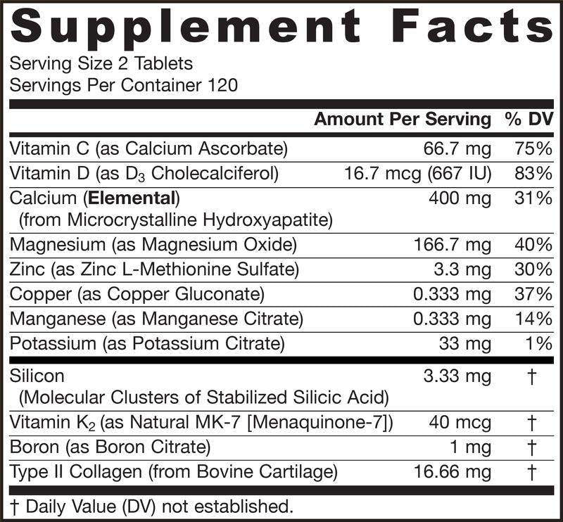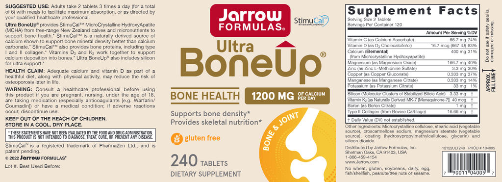 Ultra Bone-Up ® is an ultra bone-health system that provides StimuCal™ MicroCrystalline HydroxyApatite (MCHA) and micronutrients for bone health. StimuCal™ MCHA is a natural source of calcium shown to support bone health and not spike calcium levels in the blood with supplementation.* StimuCal™ also provides bone proteins, including type I collagen to support bone health.* Vitamins D3 and K2 (as natural MK-7 from fermentation) support calcium deposition into bones.* Ultra Bone-Up® also includes JarroSil® Activated Silicon® for ultra support. *