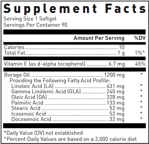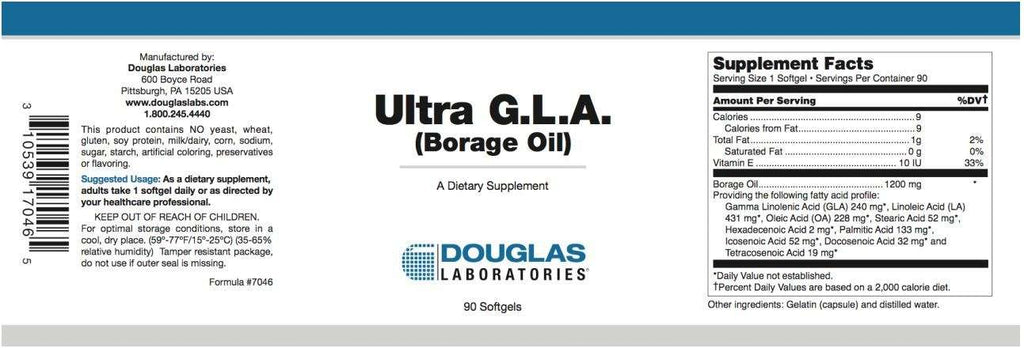 Ultra G.L.A. supplies the important gamma linolenic acid (GLA), providing 240 mg of GLA per softgel. Ultra G.L.A. softgels are manufactured using only 100% vegetable oil from borage seeds (Borago officinalis), with 10 IUs of natural vitamin E for antioxidant protection. The oil is cold-processed and handled carefully to avoid any oxidation.