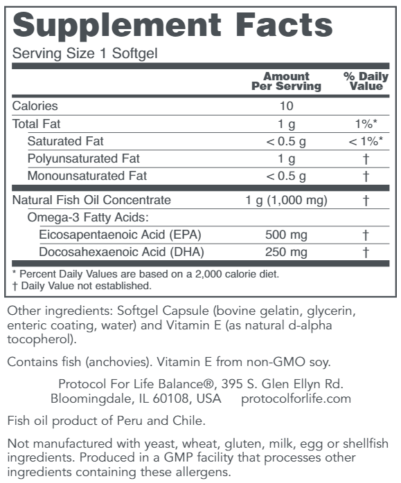 Fish oils are naturally abundant in the omega-3 fatty acids (FAs), EPA (eicosapentaenoic acid) and DHA (docosahexaenoic acid). EPA and DHA are important structural components of cell membranes, affecting membrane fluidity, flexibility, and permeability, as well as the efficiency and character of cellular signaling.* Omega-3 FAs are especially critical for proper immune system function, and help to maintain cardiovascular and joint health.* Omega-3 FAs are concentrated in eye and brain tissues, where they help to promote proper function of the central nervous system and support eye health.*