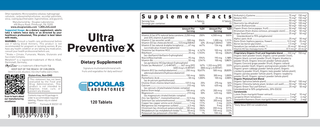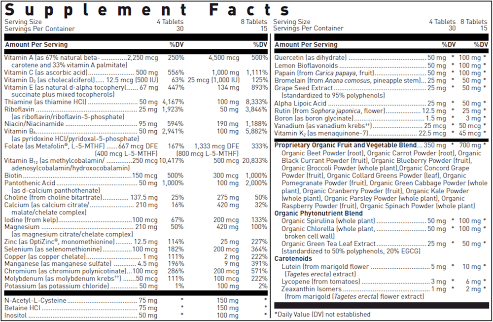 Ultra Preventive® X is Douglas Laboratories’ signature formula and the most comprehensive multivitamin and mineral supplement, with an organic fruit, vegetable and phytonutrient blend. This unique formula provides antioxidant support and many beneficial nutrients, including carotenoids, flavonoids, polyphenols and bioavailable forms of vitamins and minerals that contribute to optimal health.†
