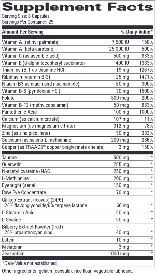 While a deficiency of even one nutrient may damage eyes and cause vision problems, the risk for cataracts, macular degeneration and other vision problems is most significant when several specific nutrients are low in the diet. This comprehensive nutritional formula provides the nutrients specifically related to the support of eye health and vision.