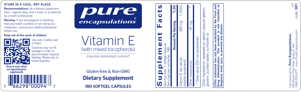 Vitamin E with mixed tocopherols is designed to promote antioxidant protection and cardiovascular health. Vitamin E with mixed tocopherols supports cellular respiration of muscles, especially cardiac and skeletal muscles.