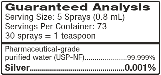 Sovereign Silver has only two ingredients: 99.999% pure silver and pharmaceutical-grade purified water. It does not contain added salts or proteins that render other silver products less effective. Plus, it is packaged in non-leaching glass bottles, never plastic.