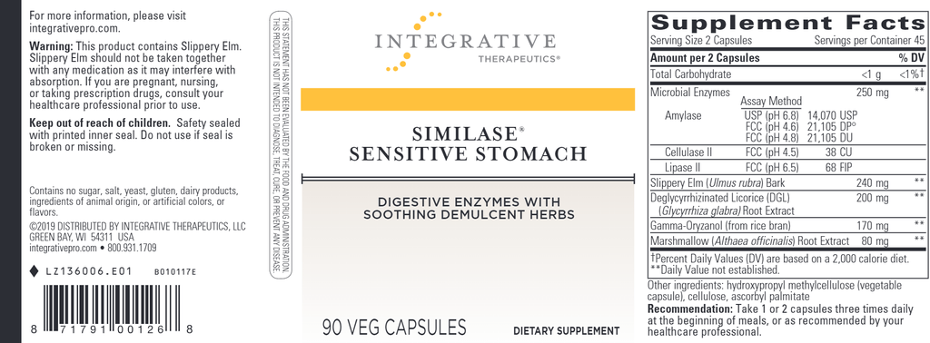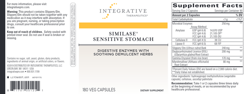 Similase® Sensitive Stomach combines enzymes and demulcent herbs to provide gentle support for the GI tract.* Similase Sensitive Stomach features Microbial Enzymes and the demulcent herbs, marshmallow and slippery elm, to provide gentle support for digestion.*