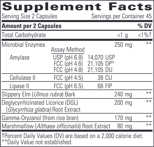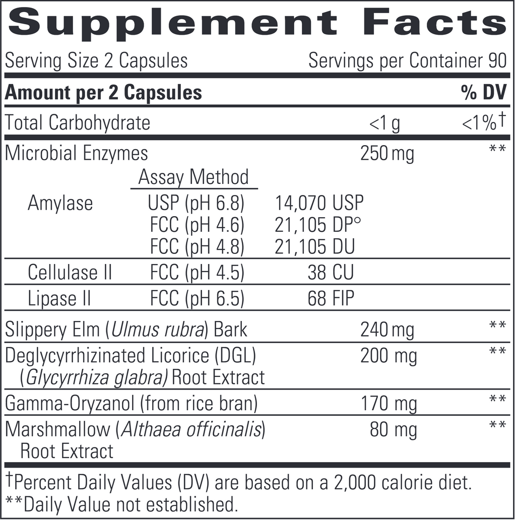 Physician-formulated Similase® Sensitive Stomach combines Microbial Enzymes with the demulcent herbs marshmallow and slippery elm to provide gentle support for the GI tract.* Gamma-oryzanol and licorice root complement the demulcent herbs for soothing gastric mucosa support, and protease is omitted due to its potential for irritation in sensitive patients.*