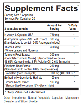 Bromelain: Bromelain is a plant enzyme that is naturally found in the stem and fruit of the pineapple plant. Bromelain exerts a synergistic effect when combined with NAC due to its proteolytic (protein-digesting) effects. Bromelain has been shown to be effective at thinning nasal secretions and provides an additional benefit of balancing inflammatory response.