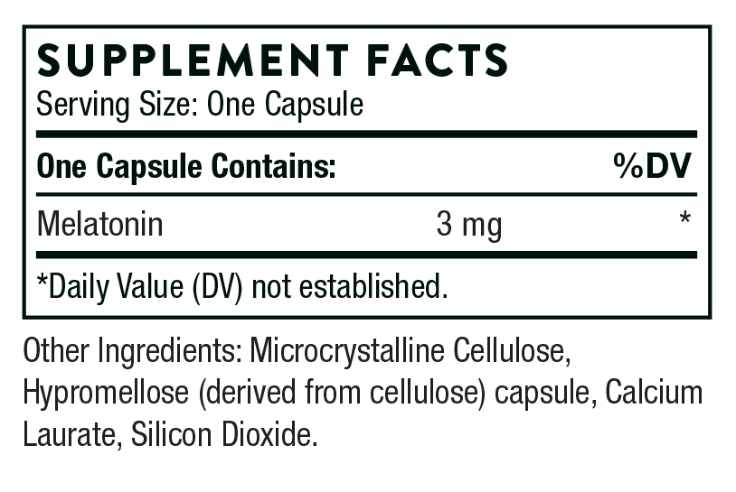 Melaton-3, which contains 3 mg of melatonin per capsule, helps maintain your normal sleep-wake cycle – your circadian rhythm.* In an individual who has difficulty sleeping or has altered circadian rhythms – such as occurs in jet lag and night shift work – supplementation with melatonin promotes the resynchronization of this cycle.* An adequate melatonin level has been reported to be a positive factor in cardiovascular, neuroendocrine, and bone health.* Research indicates melatonin exerts its sleep-promoting action by decreasing the amount of time it takes to fall asleep – by improving the ability to stay asleep and by enhancing the depth of sleep.*