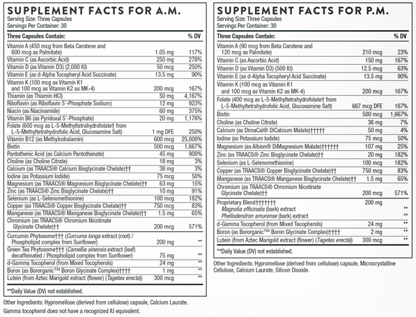 Multi-Vitamin Elite provides two multi-vitamin/mineral formulas to meet daytime and nighttime needs. The A.M. formula helps boost energy during the daytime, while the P.M. formula supports rest and recovery at night.* The P.M. formula contains more minerals, and also contains Relora®, a proprietary blend of two plant extracts shown to curb late-night food cravings, optimize the stress hormone cortisol, aid in weight management, and support restful sleep.*