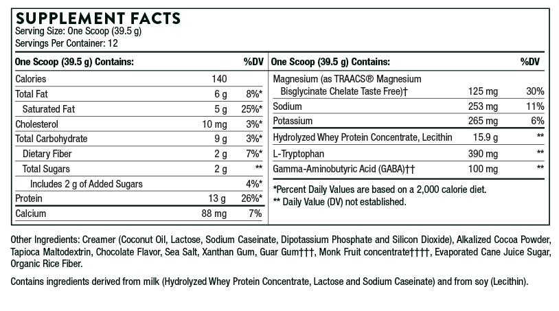 RecoveryPro® a synergistic blend of four proven ingredients to moderate stress, support restful sleep, and optimize nighttime muscle recovery.* It contains a unique blend of whey protein, tryptophan, natural-source GABA (PharmaGABA®), and well-absorbed magnesium bisglycinate in a chocolate-flavored powder that mixes easily in water and tastes great hot or cold. When taken before sleep, RecoveryPro works to support restful sleep*, optimizes nighttime muscle recovery*, enhances lean muscle mass while you sleep*, and can lower cortisol to help modulate stress.*