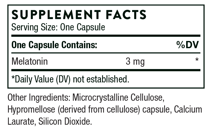 Melaton-3, which contains 3 mg of melatonin per capsule, helps maintain the normal sleep-wake cycle – the circadian rhythm.* In an individual who has difficulty sleeping or has an altered circadian rhythm – such as occurs in jet lag and night shift work – melatonin supplementation promotes the resynchronization of this cycle.* An adequate melatonin level has also been reported to be a positive factor in supporting cardiovascular, neuroendocrine, gastrointestinal, and bone health.*