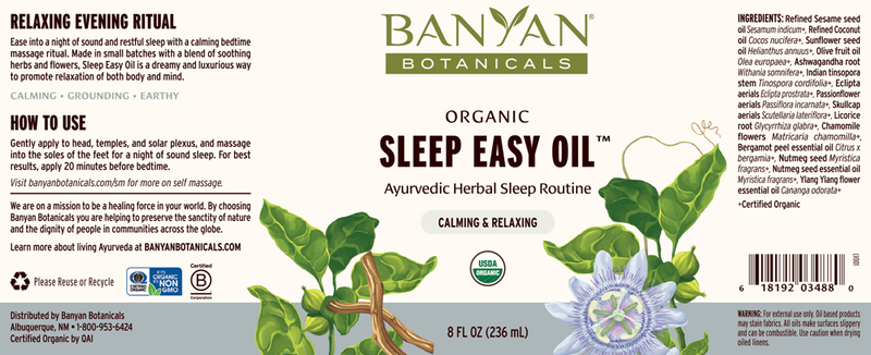 This calming and relaxing oil brings you powerful Ayurvedic herbs that promote healthy sleep patterns and deep rest and relaxation. Healthy sleep patterns are crucial as they allow the body to restore and rejuvenate while letting the mind process, learn, and de-stress. This cooling and soothing formula is intended to be used with the traditional method of head and foot massage at night before going to bed. Application to the head, temples, and soles of the feet helps ground the light and mobile nature of vata and balance the sharp and active nature of pitta, promoting the heavier qualities needed for sleep. Massage Sleep Easy Oil into your head and feet for a rejuvenating night of rest. One of the best oils for sleep, this herbal blend is in a base of four organic oils, which come together to bring nourishment, subtle warmth for penetration, and gentle cooling for relaxation. Each batch is finished with nutmeg, bergamot, and ylang ylang essential oils, which provide relaxing and subtle floral notes to the oil.