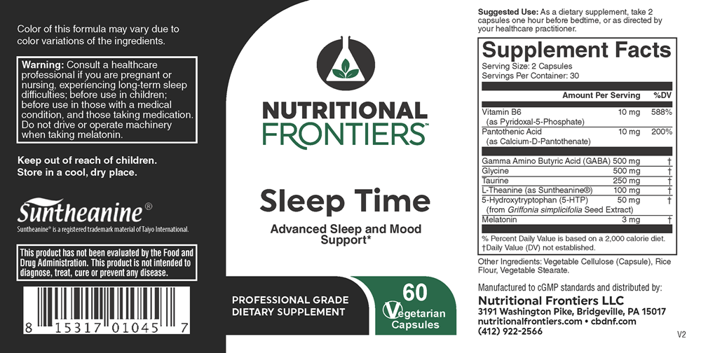 The Sleep Time formulation, to be taken 1 hour before bed, is designed to promote restful sleep and may help the body to deal with occasional stress* Sleep Time was formulated to help support the neurotransmitters dopamine and serotonin, which have a role with sleep cycles.*
