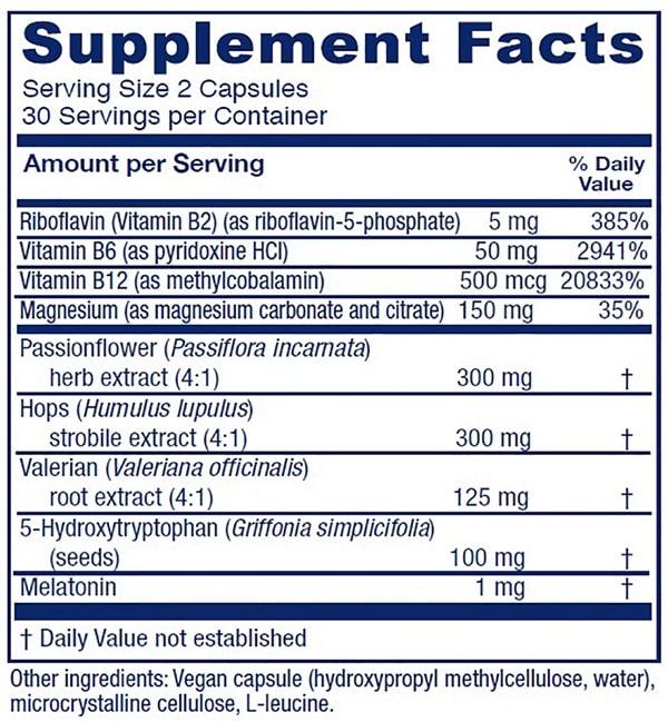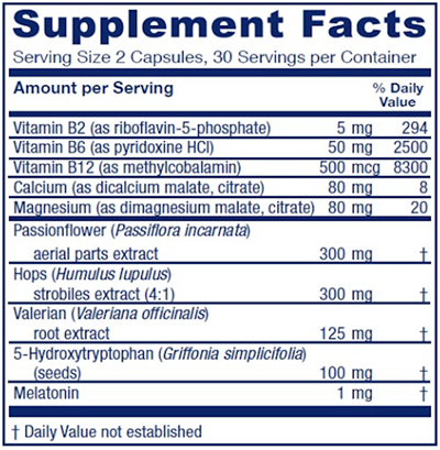 Promotes restful and relaxing sleep with a thoughtful blend of quality botanicals and nutrients; maintains a healthy circadian rhythm by supporting serotonin and tryptophan naturally.*