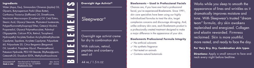 Sleepwear works overnight to smooth the appearance of lines and wrinkles as it dramatically improves moisture and tone. With Sleepwear's trusted "dream team" formula of calcium, retinol, peptides and cranberry seed oil, dry skin awakens replenished and energized. Skin looks more youthful, more rested and ready to face the day.