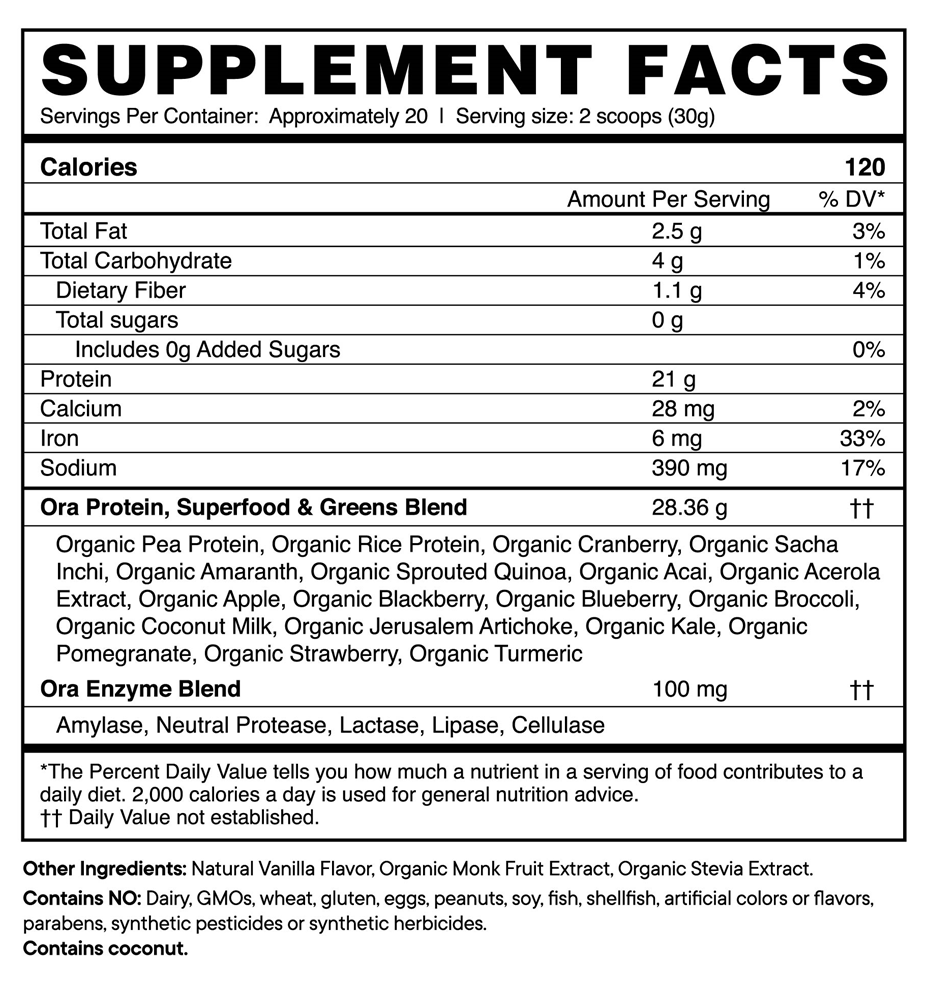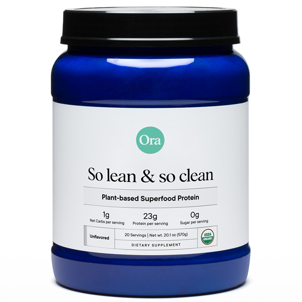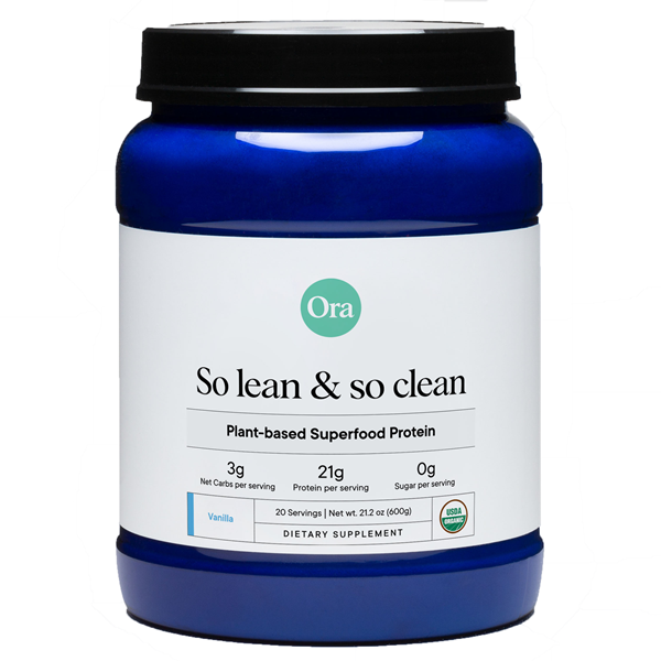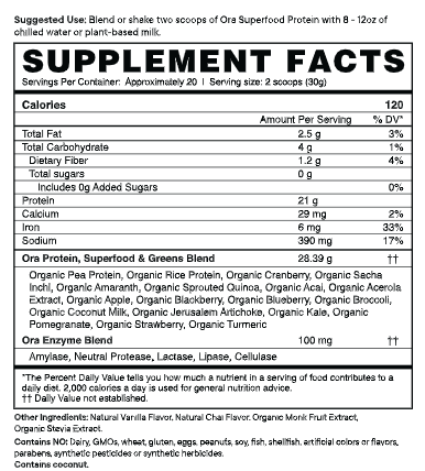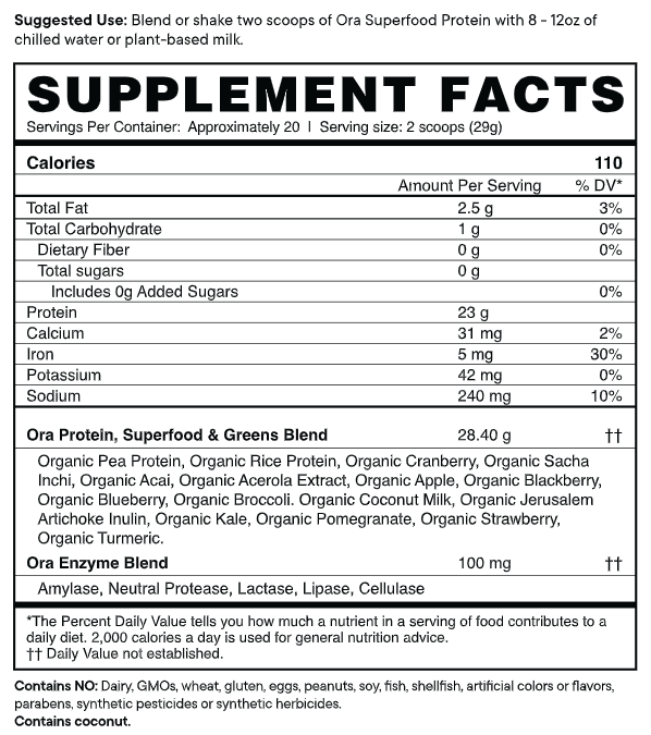 Blend or shake two scoops of Ora Superfood Protein with 8 - 12 oz of chilled water or plant-based milk.