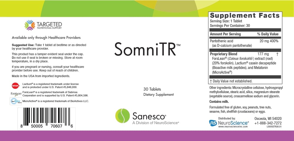 SomniTR also provides support for GABA-A receptor sites.* GABA-A agonists, such as Lactium have been shown to support quality of sleep.* ForsLean supports cAMP while pantothenic acid supports acetyl coenzyme A, both of which are important in melatonin synthesis.*