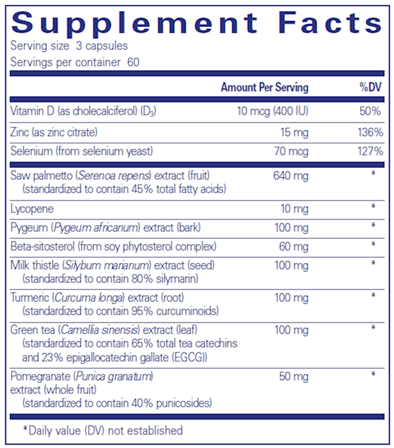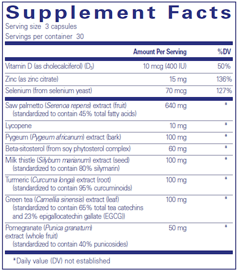Comprehensive prostate formula; provides enhanced support for prostate function and prostate cellular health.