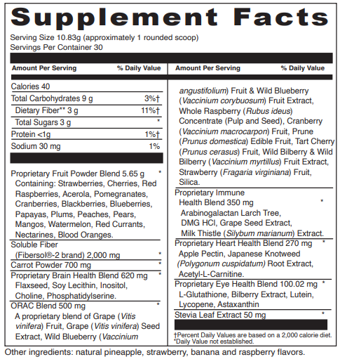 Spectra Reds™ contains nutrient rich berries, fruits and potent plant extracts in combination with DMG HCl, acetyl L carnitine, phosphatidylserine, resveratrol, lycopene and lutein. It helps to support optimal liver, immune, neurological, cardiovascular and eye functions.* This delicious fruity powder is a convenient way to boost your energy and support the body in attaining optimal health.* Each serving contains a minimum of 5000 ORAC units and 3 grams of fiber for digestive tract support.*