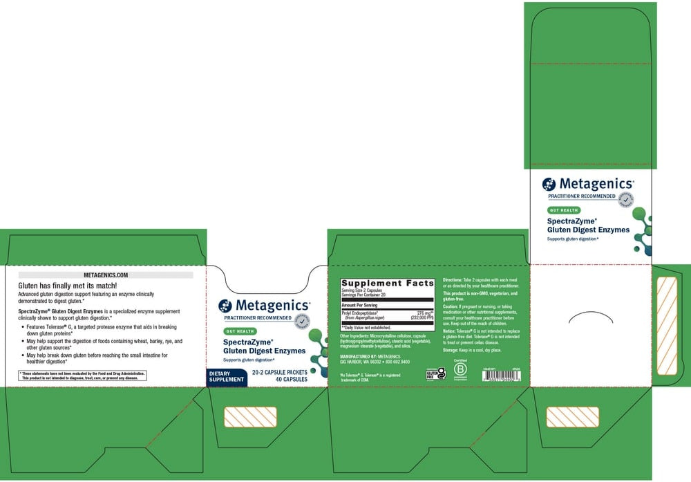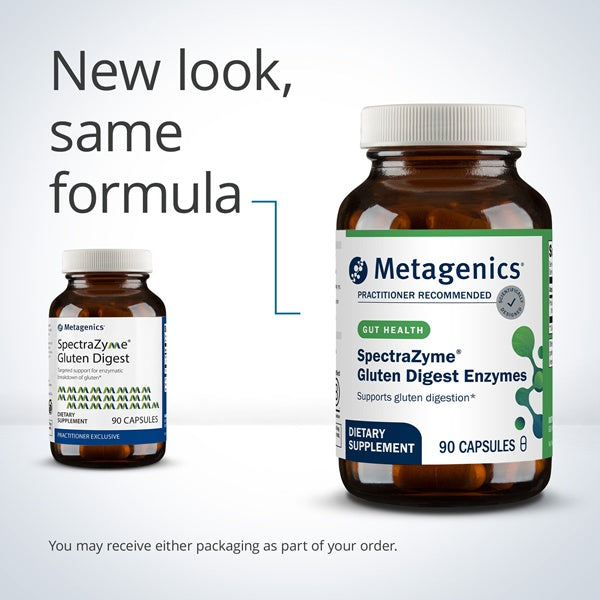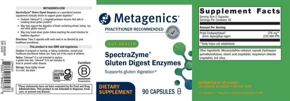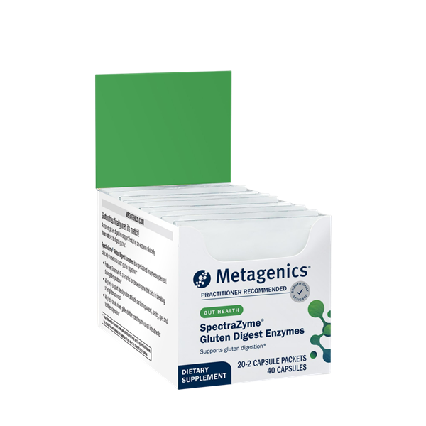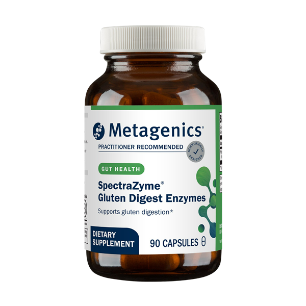 SpectraZyme® Gluten Digest Enzymes—formerly known as SpectraZyme® Gluten Digest—featuring Tolerase® G, is a targeted protease enzyme supplement that has been clinically shown to help digest gluten in humans as well as in gastrointestinal and in vitro models. This formula helps promote the breakdown of gluten proteins in the stomach which may help support healthy digestion of wheat, barley, rye, and other sources. Human studies also indicate that Spectrazyme® may help break down gluten proteins before they reach the small intestine, a key consideration in healthy digestion.*