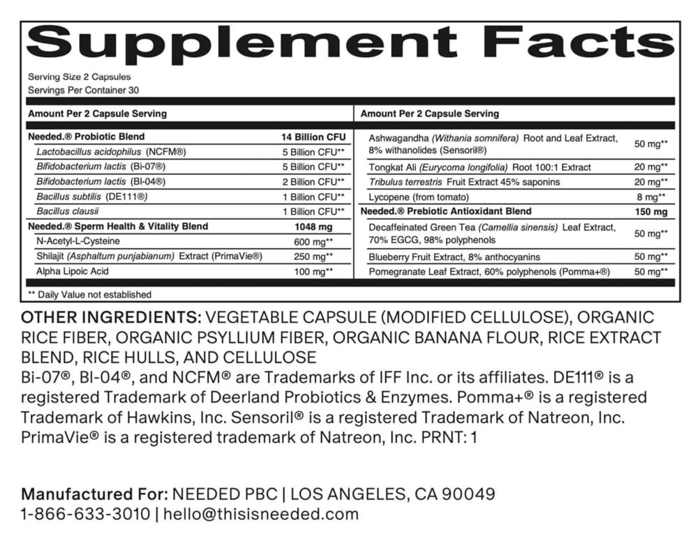 Needed's Sperm Support+ combines pre and probiotics, antioxidants, and botanicals for a whole body approach to male fertility.