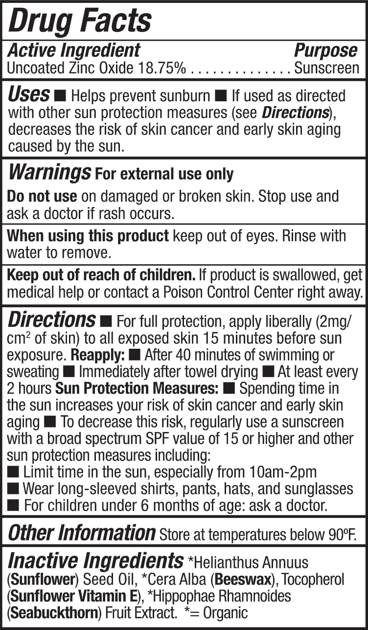 Inactive Ingredients: *Helianthus Annuus (Sunflower) Seed Oil, *Cera Alba (Beeswax), *Simmondsia Chinensis (Jojoba) Seed Oil, Tocopherol (Sunflower Vitamin E). *Organic.