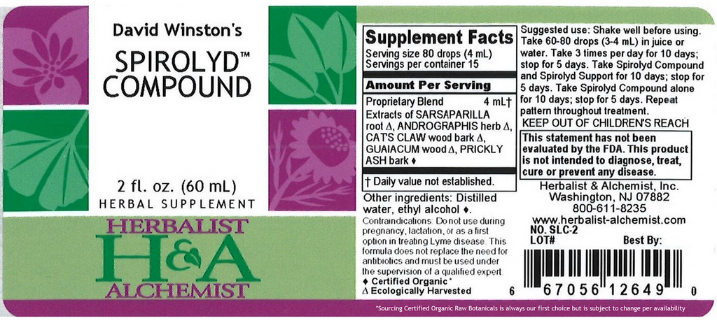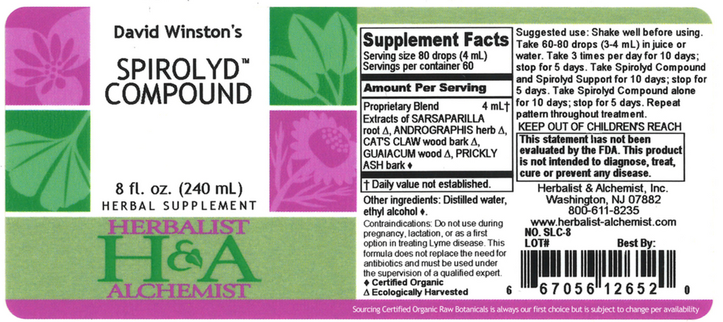 Herbalist & Alchemist blends David Winston’s Spirolyd Compound™ from extracts of Sarsaparilla root (Smilax ornata), Andrographis herb (Andrographis paniculata), Cat’s Claw wood (Uncaria tometosa), Guaiacum wood (Guaiacum officinale) and Prickly Ash bark (Zanthoxylum lavaherculis). The organically grown or ecologically harvested botanicals are extracted separately into Certified Organic, USP Pharmaceutical Grade Alcohol before blending.