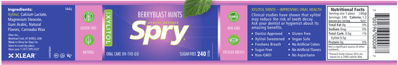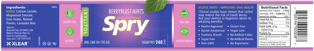 Frequent eating of foods high in sugars and starches can promote tooth decay. Clinical studies have shown that the use of xylitol on a daily basis, spread throughout the day, may reduce the risk of tooth decay. for best results let Spry Mints dissolve slowly in the mouth after each meal.