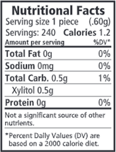 Other Ingredients: Xylitol, calcium lactate, magnesium stearate, gum Arabic, natural raspberry essence, natural blackberry essence, beeswax (glazing agent)