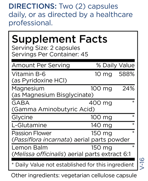 Anxiety Control Plus combines passionflower and lemon balm with a nutrient blend including GABA and L-glutamine, in support of the soothing GABA pathway. GABA is used by the body to mitigate the effects of excitatory neurochemicals. We’ve incorporated lemon balm, an herb with growing evidence to support calm, with constituents that may assist the GABA pathway. Use during a stressful day to support a relaxed sense of being. In the evening, ingredients like magnesium and glycine help quiet the mind, relax muscles, and improve sleep quality.